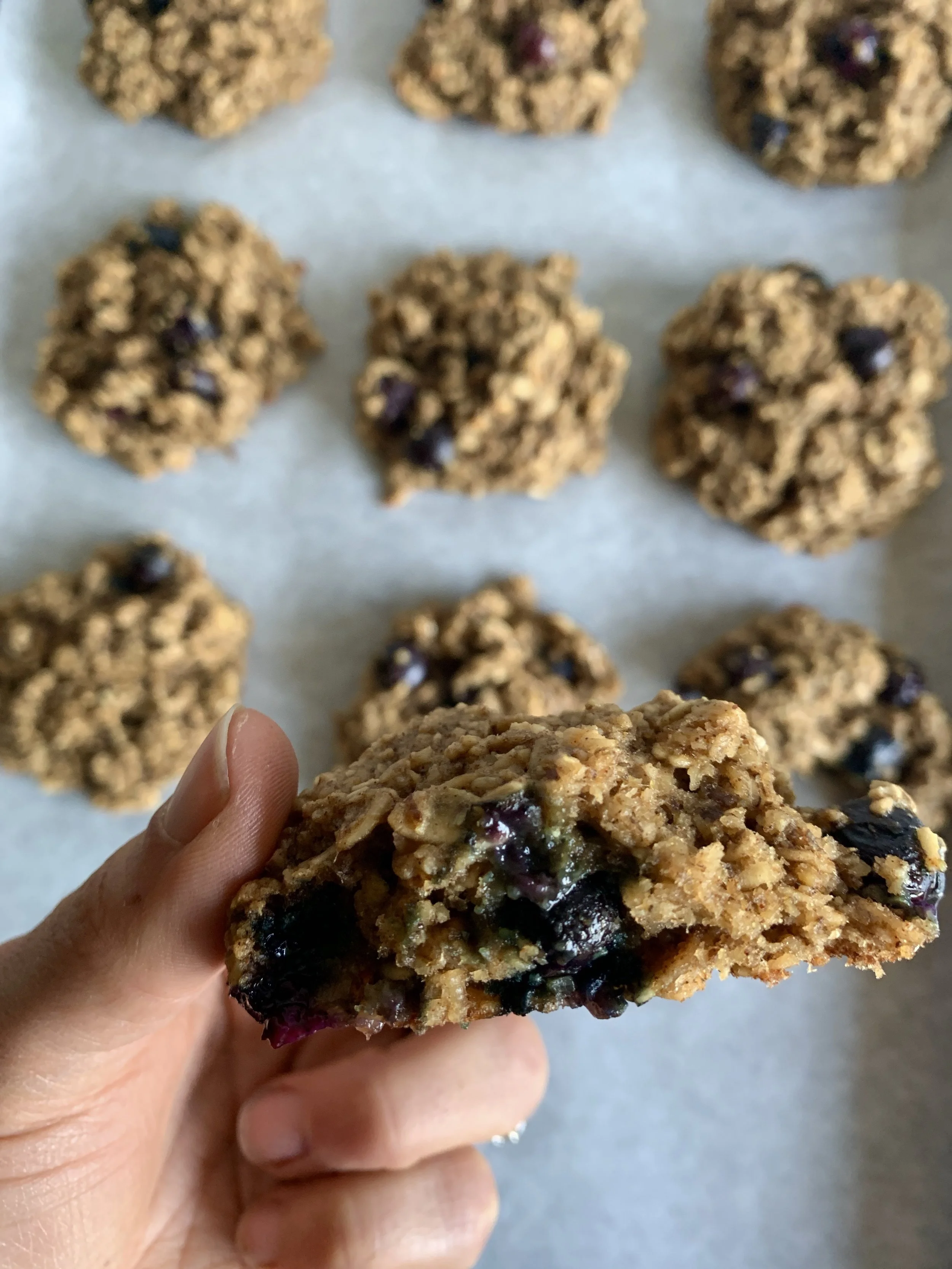 Just popping in a for a quick, sweet snack that’s definitely more summer inspired even though the calendar says it’s Fall [still 80 degrees in Nashville]! Also, I thought it was time to admit that I’m definitely that person who’s always searching for something sweet to snack on soon after [both] lunch and dinner. Although a piece of fruit might do the trick sometimes, in most cases I want something hearty that’s in the shape of a cookie or a muffin — anyone with me?! And these Vanilla Blueberry Banana Cookies did the trick. Plus, combining food groups, like I did with these healthier cookies, instead of munching on a single food can have a beneficial impact on satiety.