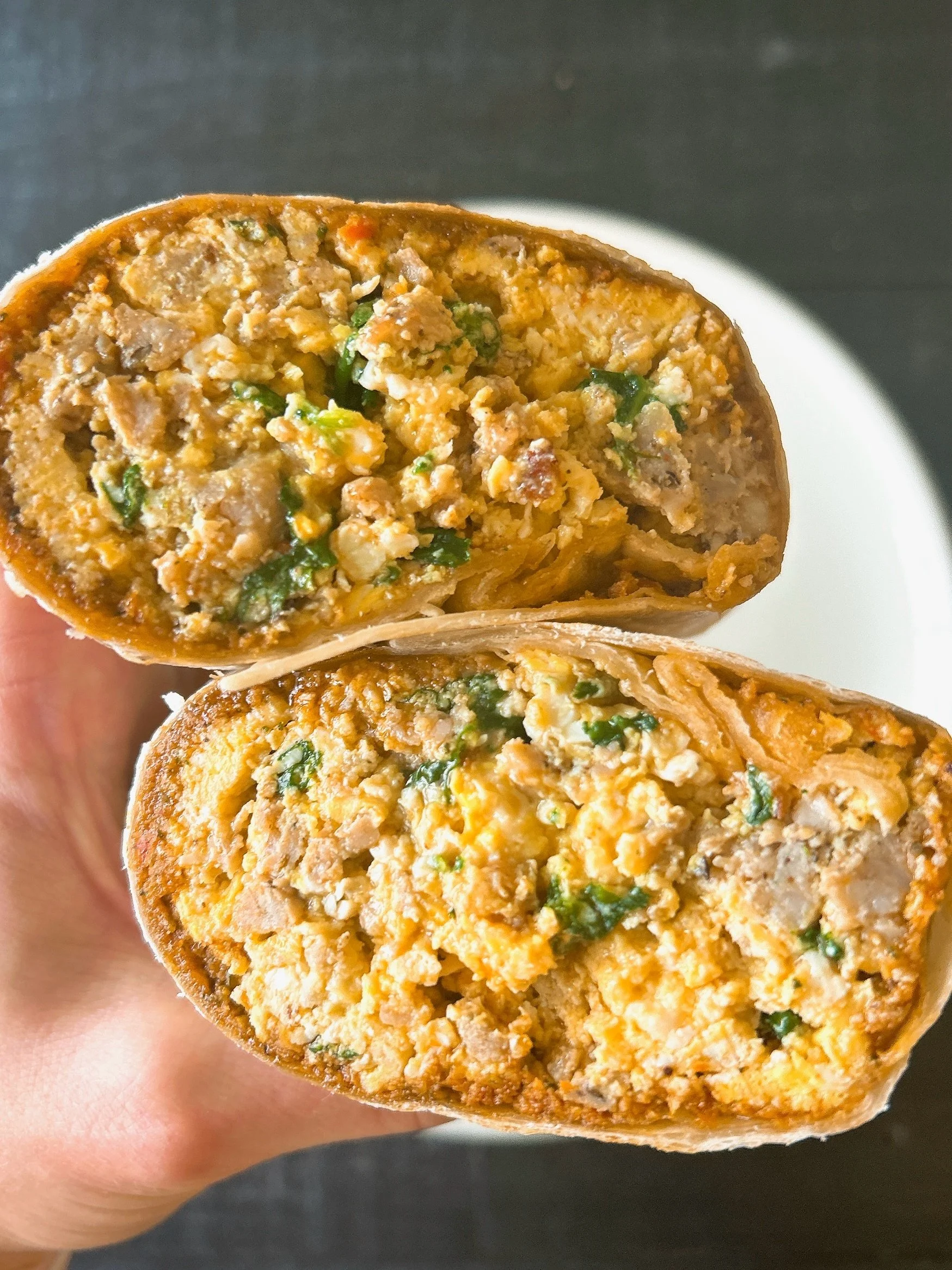 Place tortillas on a flat surface and spread 1 tbsp sun-dried tomato pesto on each. Add ~1/2 cup egg mixture to one side of each tortilla. Fold the tortilla over, tucking in the ends as you continue to roll. Optional: pan sear the tortillas, seam-side down first, in butter/olive oil.